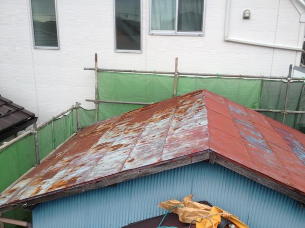 古く、錆なども目立つ屋根の改修工事のご相談をいただきました。劣化がひどく、下地等の処理を行い新たにトタンを張りました。ご予算等もお客様にご満足いただけるよう、なるべく自分達の力で行おうと決まり、足場は自分達で組み上げました。お客様に直接、目で見ていただく事は出来ませんでしたが、今ご覧の写真をお見せしましたが、目を丸くして驚かれていました!同時に、とても喜ばれており感謝のお言葉までいただいてしまいました。工事中もご親切にしていただき、こちらこそありがとうございました!!